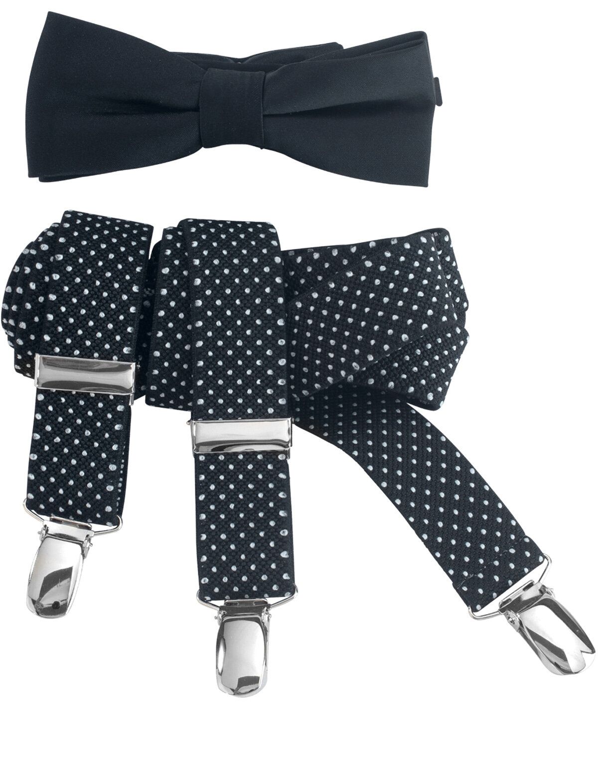 Подтяжки Y-форма ( две клипсы спереди, одна сзади ) чёрного цвета с рисунком в белую точку.