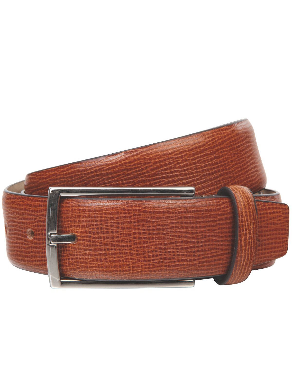 Ремень выполнен из натуральной кожи с естественными мраморными прожилкам красновато-рыжево цвета.