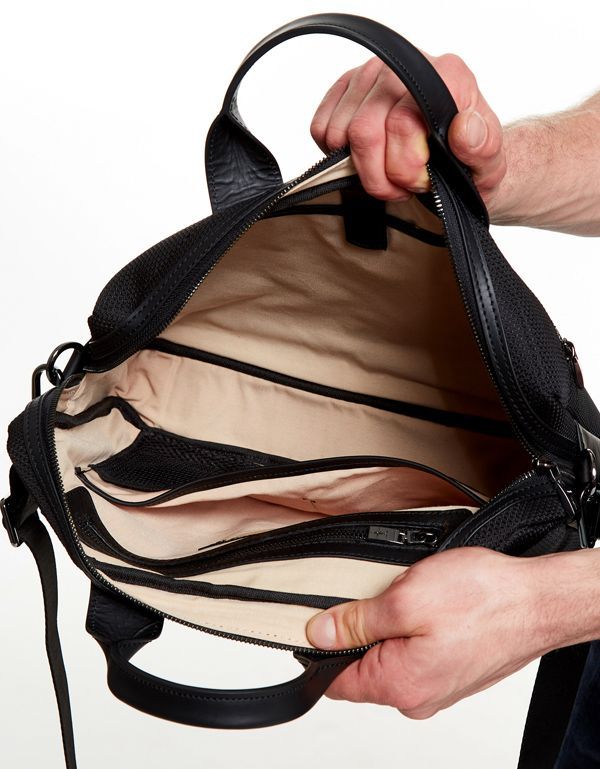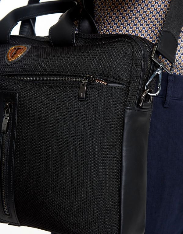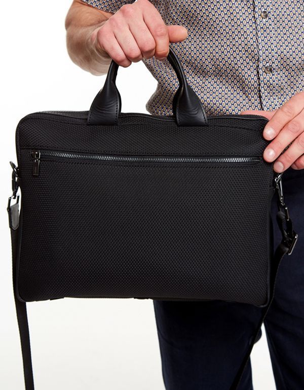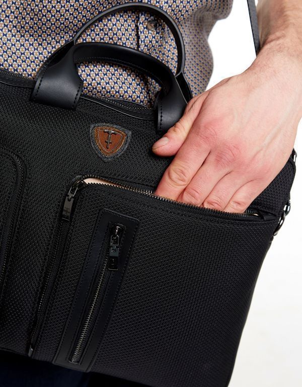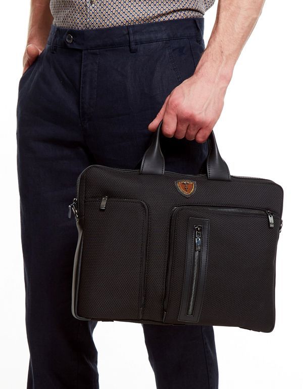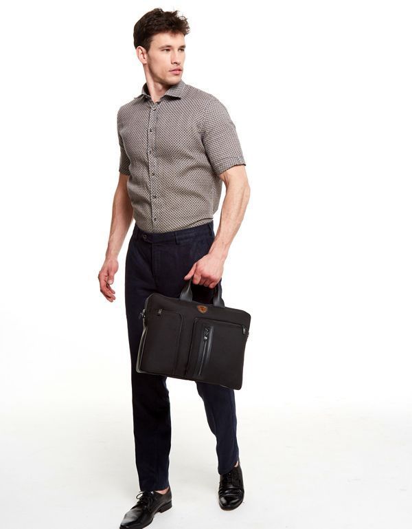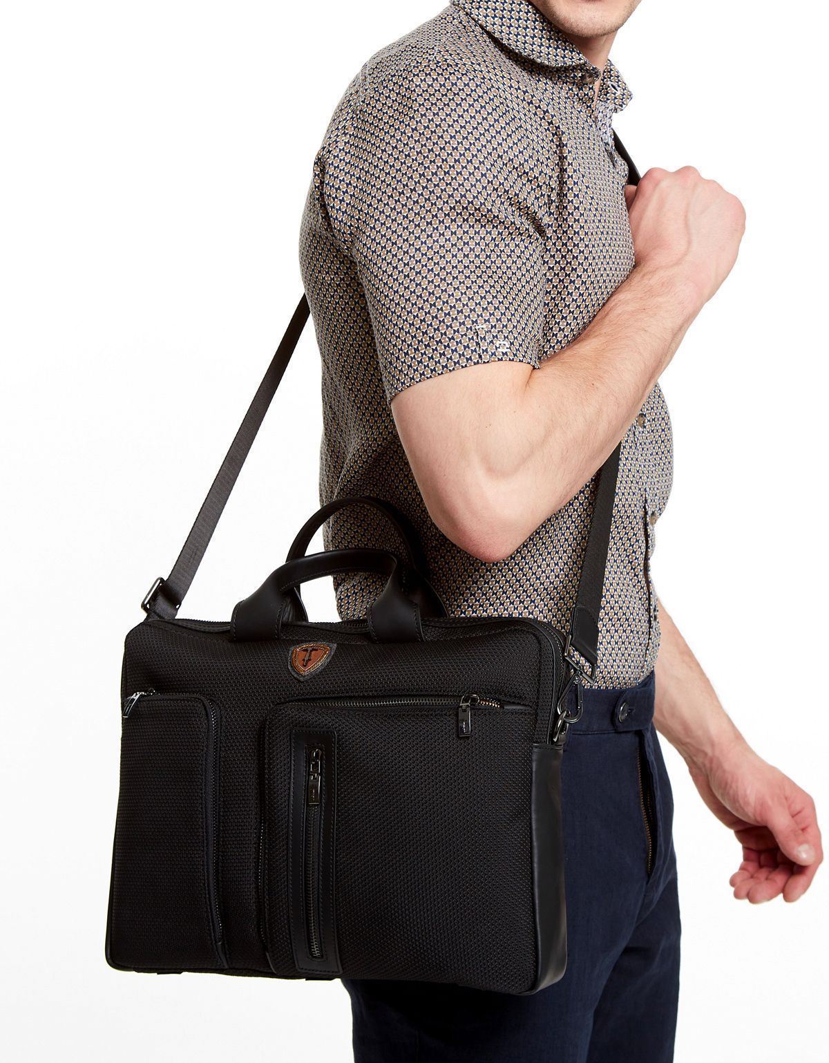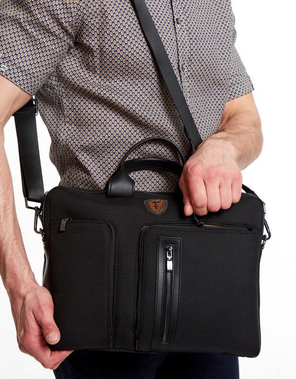 Сумка-портфель мужская бренда GRATUDE чёрного цвета из 100% полиэстера с отделкой из натуральной кожи.