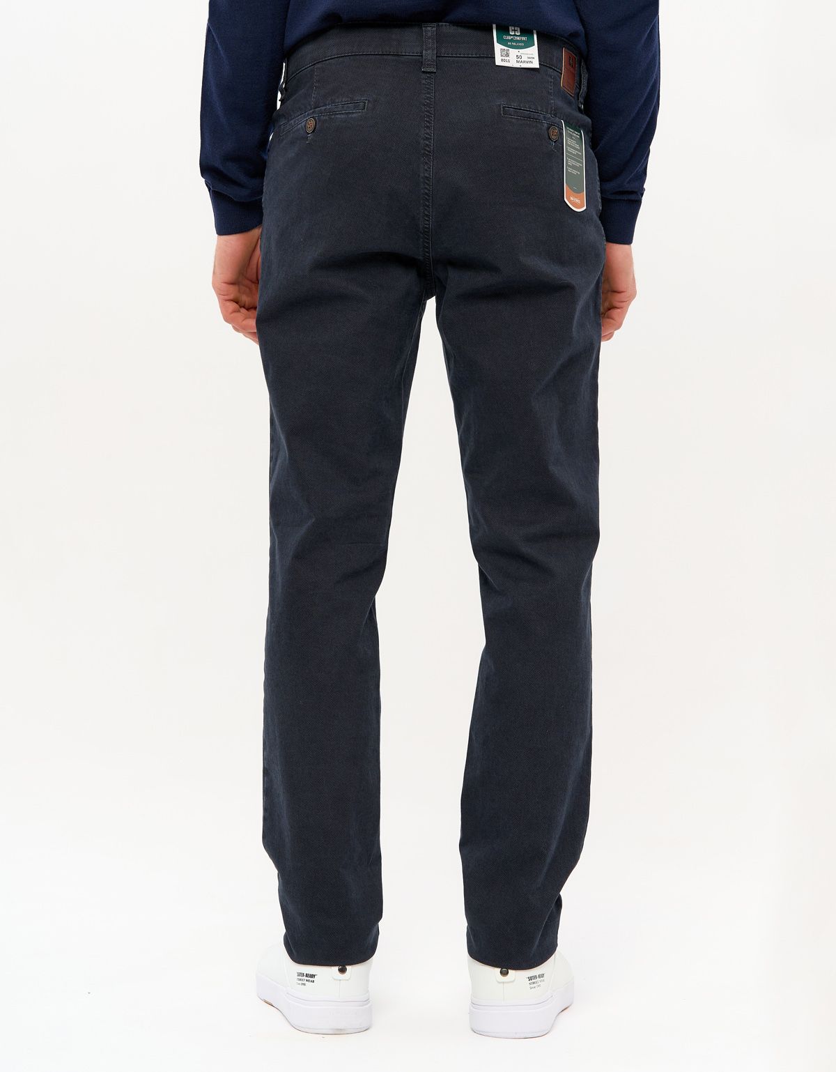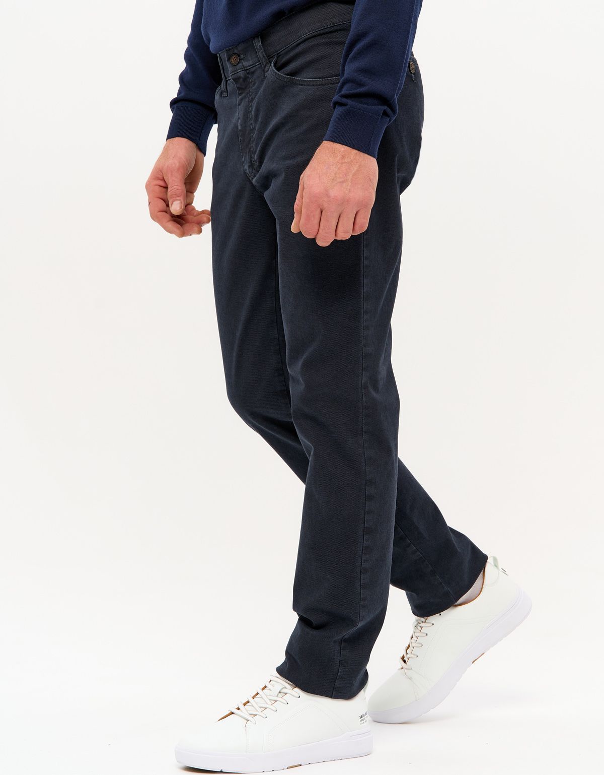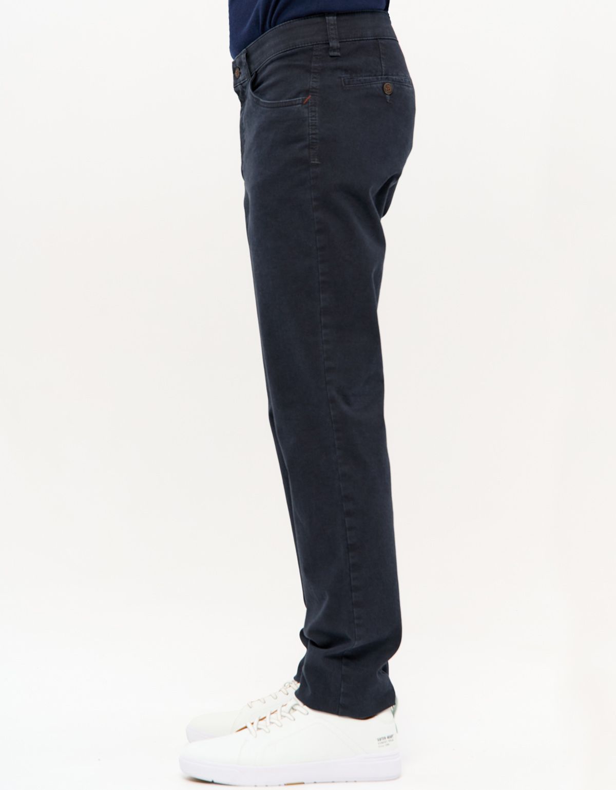 Мужские брюки из темно-синего плотного хлопка со стрейчем.