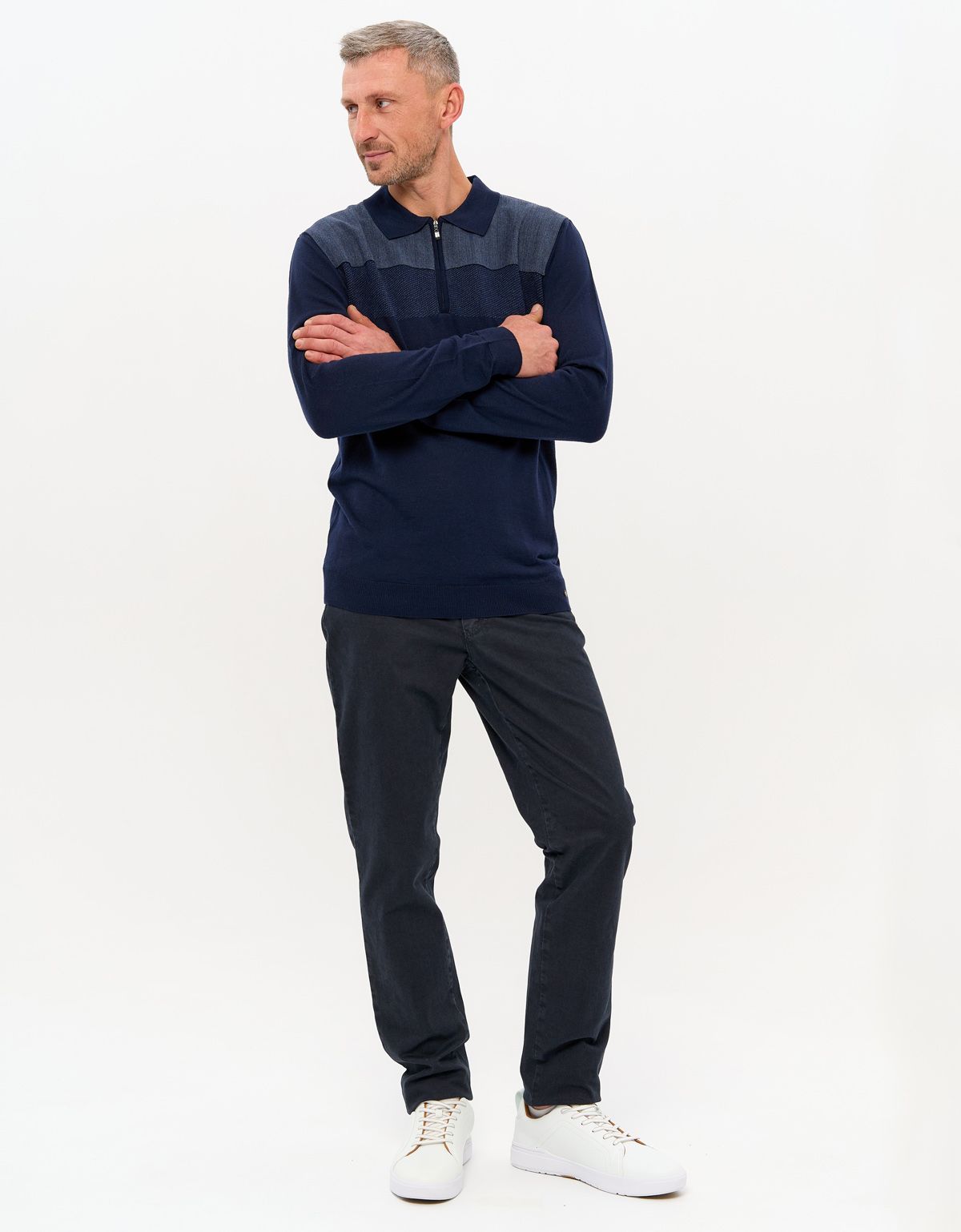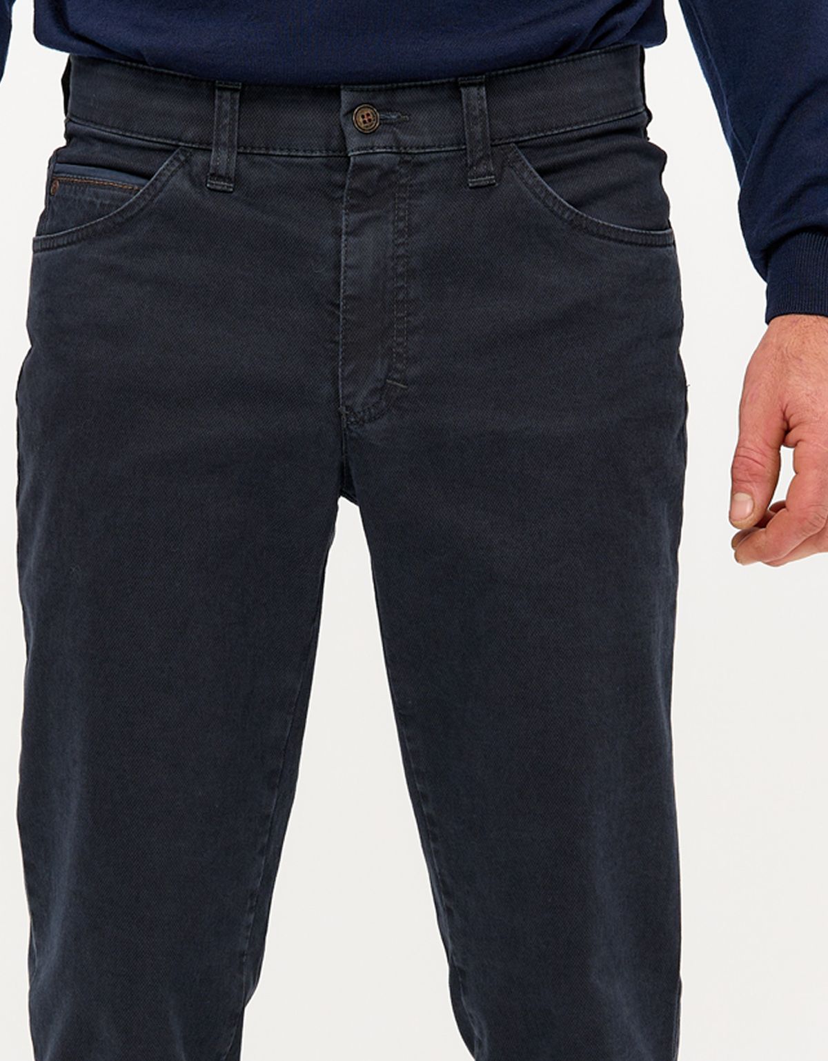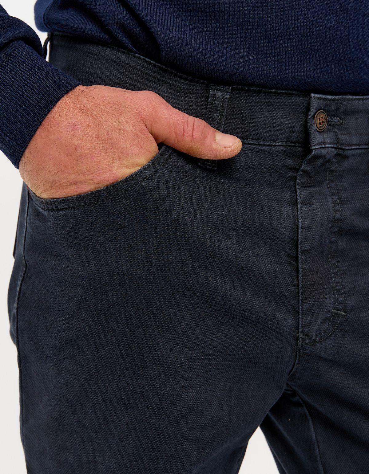 Мужские брюки из темно-синего плотного хлопка со стрейчем.