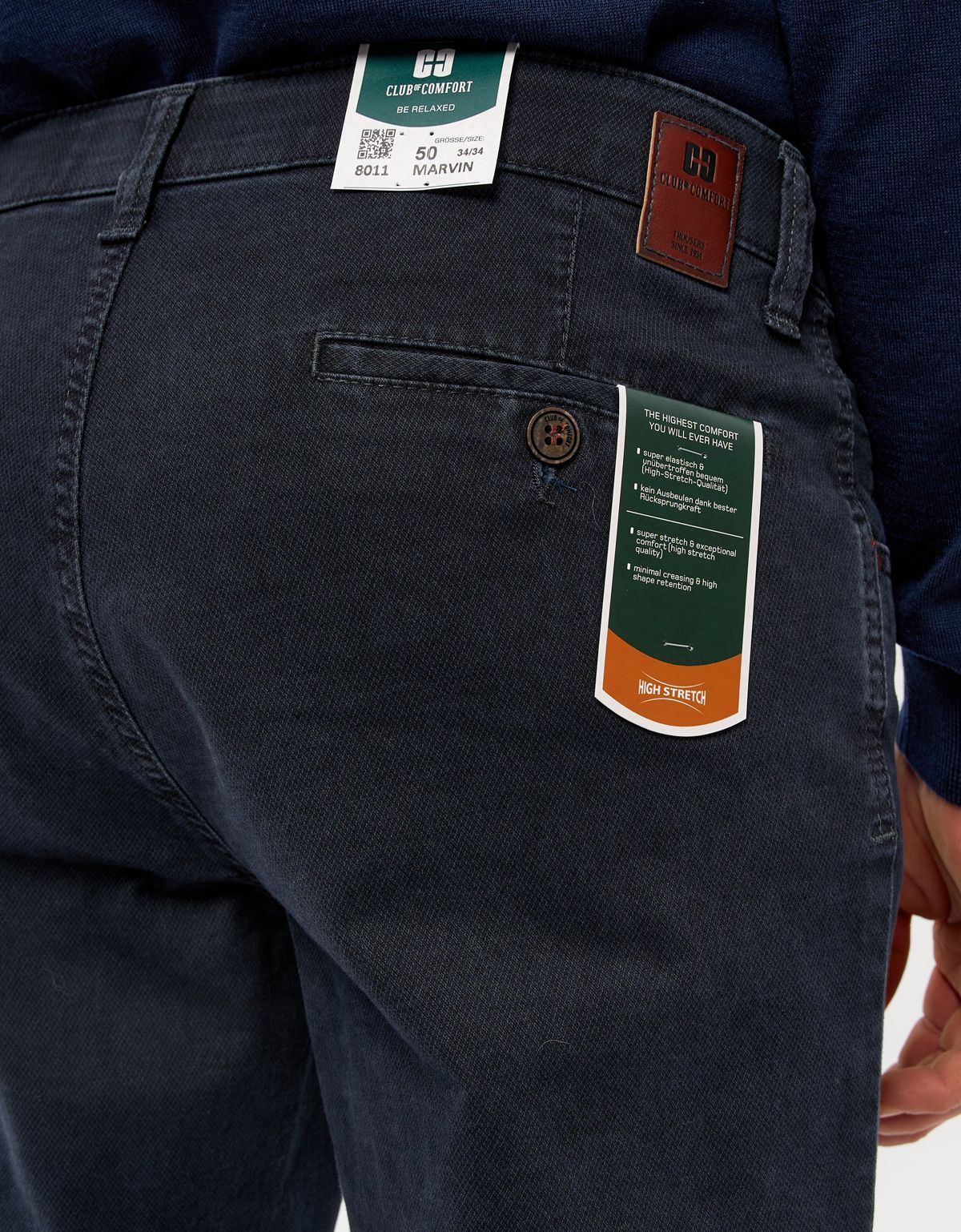 Брюки с высокой эластичностью намного более эластичны, чем традиционные брюки-стрейч. Растяжимость составляет от 30% до 45%. Обычные эластичные ткани составляют 12-18%. Высокая эластичность делает брюки особенно удобными.