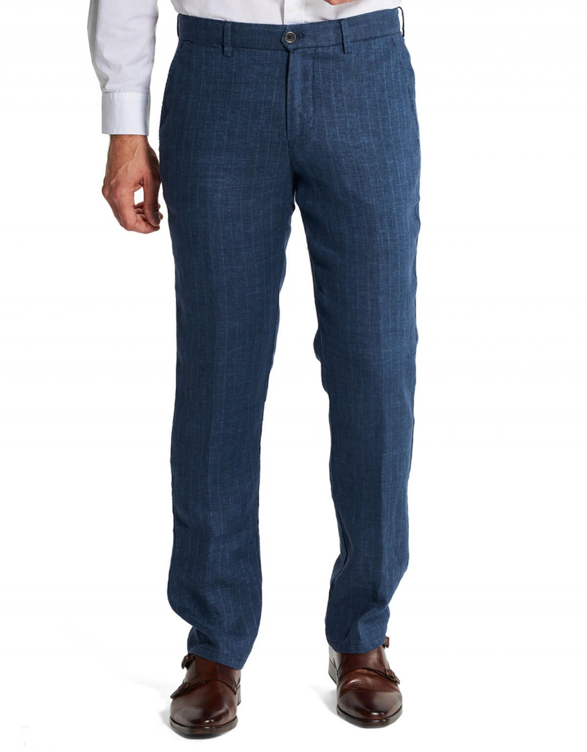 Брюки мужские, льняные немецкого бренда W.Wegener модель Conti тёмно-синего цвета в едва заметную полоску.