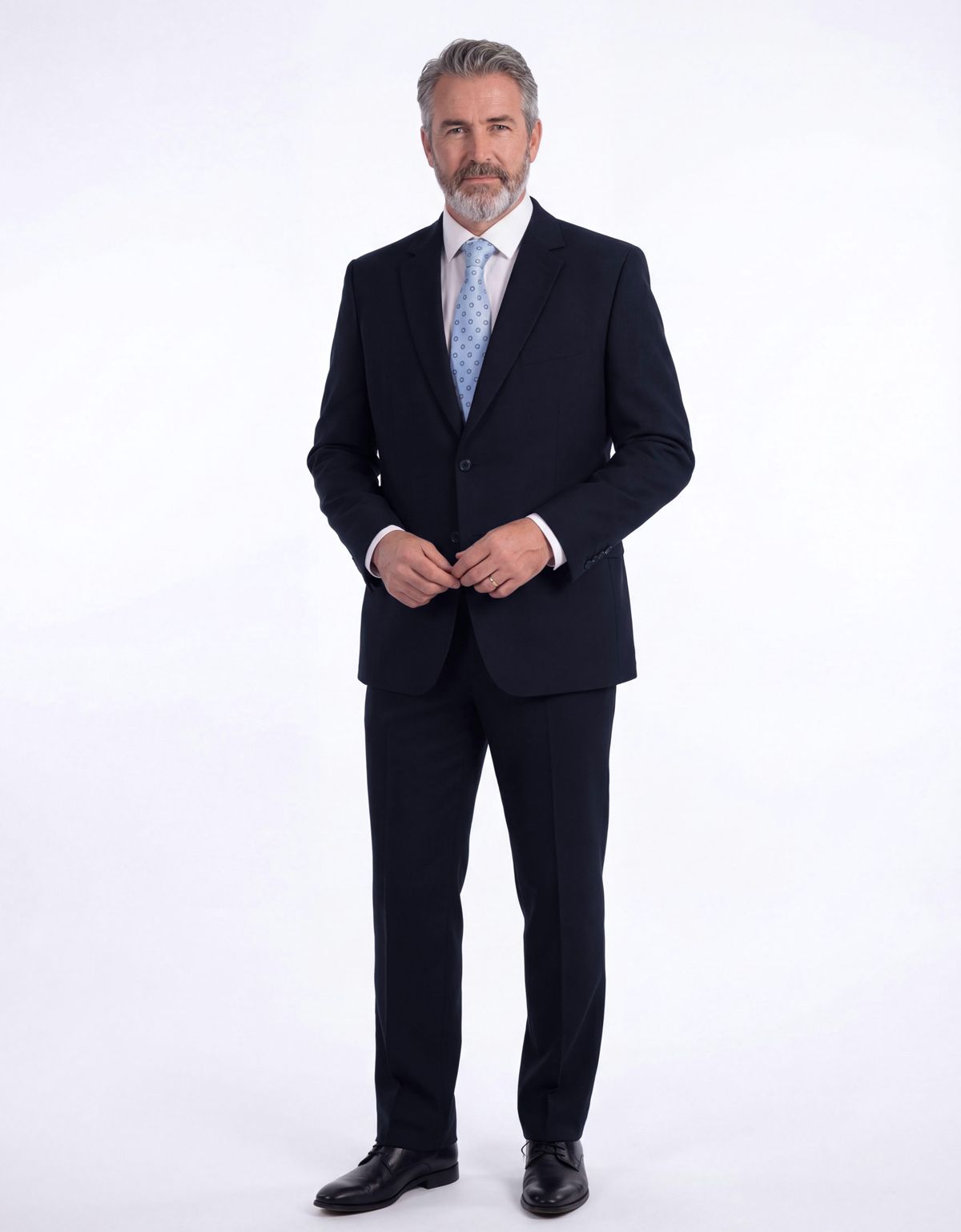 Классический мужской костюм Nowal тёмно-синего цвета с меланжевым рисунком ткани. Ткань шерстяная с добавлением вискозы и лайкры.
