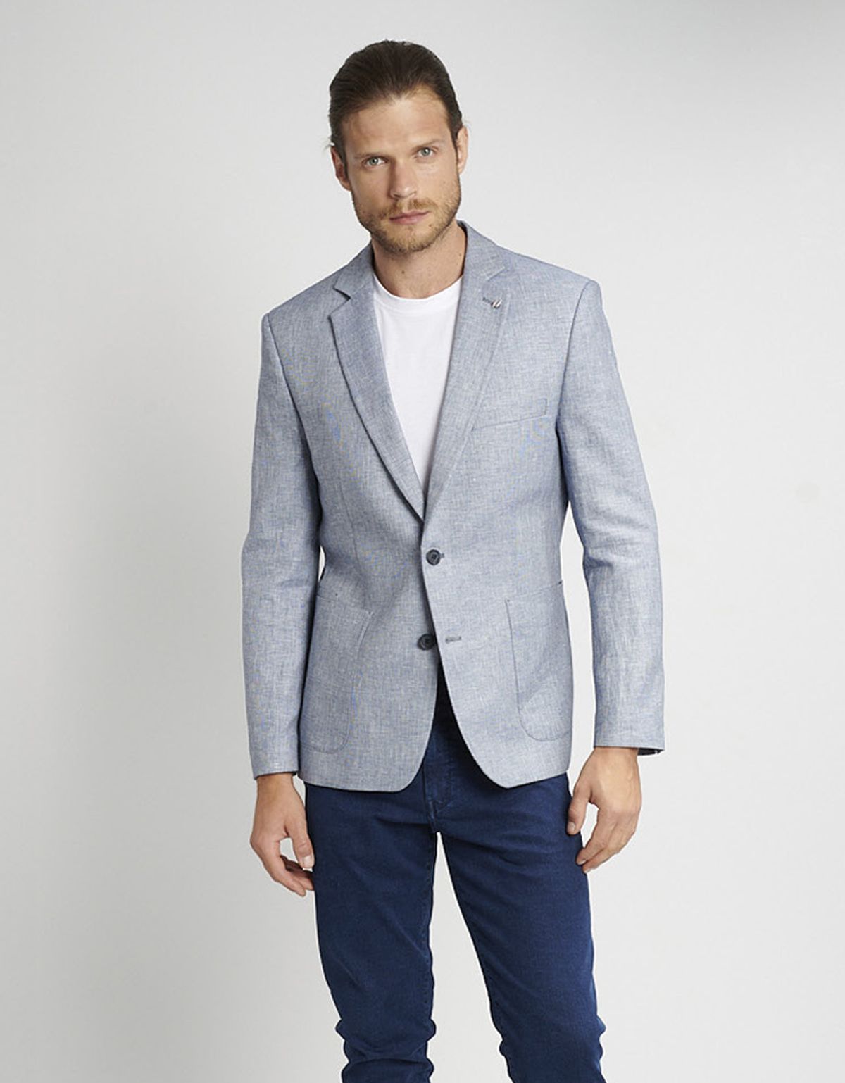 - Меланжевая фактура пиджака, сплетённая из голубых и белых нитей, придаёт изделию изысканность и современность, подчёркивая внимание к деталям и стиль владельца. Лёгкая и дышащая ткань обеспечивает охлаждающий