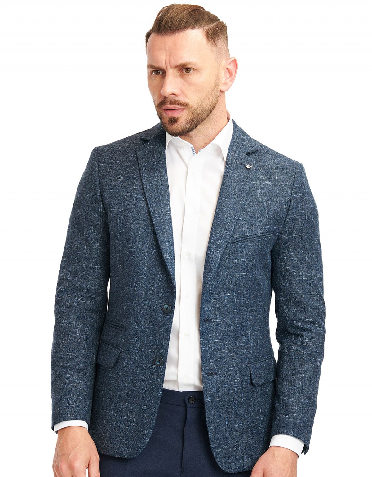 - Меланжевая фактура пиджака, сплетённая из сине-белых нитей, придаёт изделию изысканность и современность, подчёркивая внимание к деталям и стиль владельца.