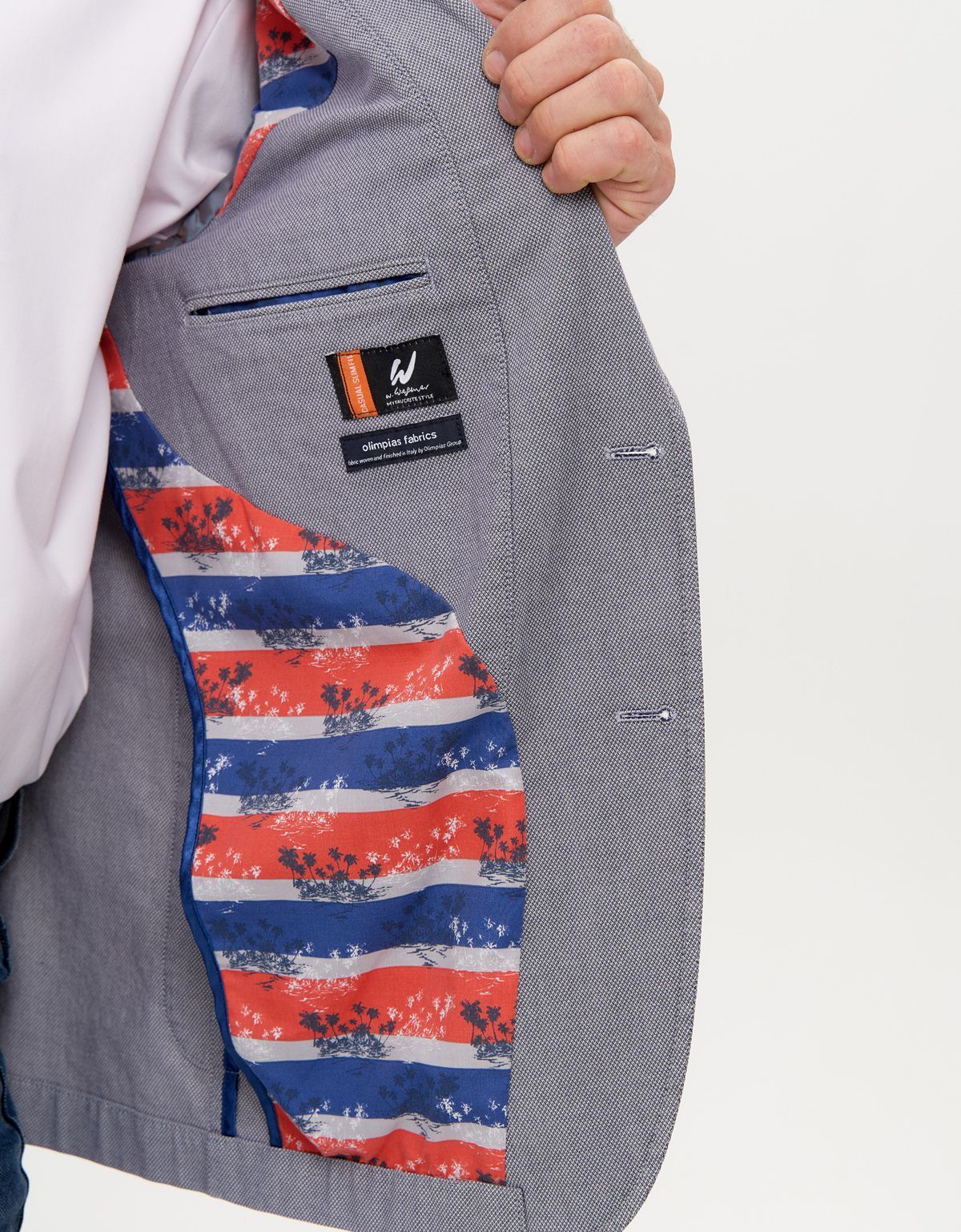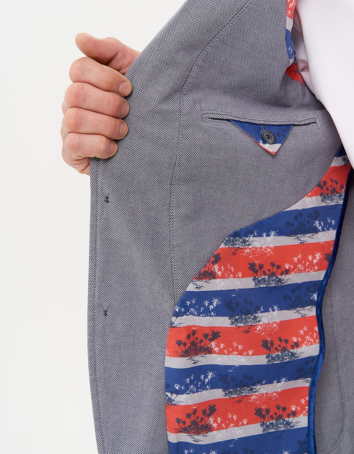 Пиджак на полуподкладе из ткани с рисунком, обработанный синим кантом, в рукавах - подклад из вискозы однотонного цвета.