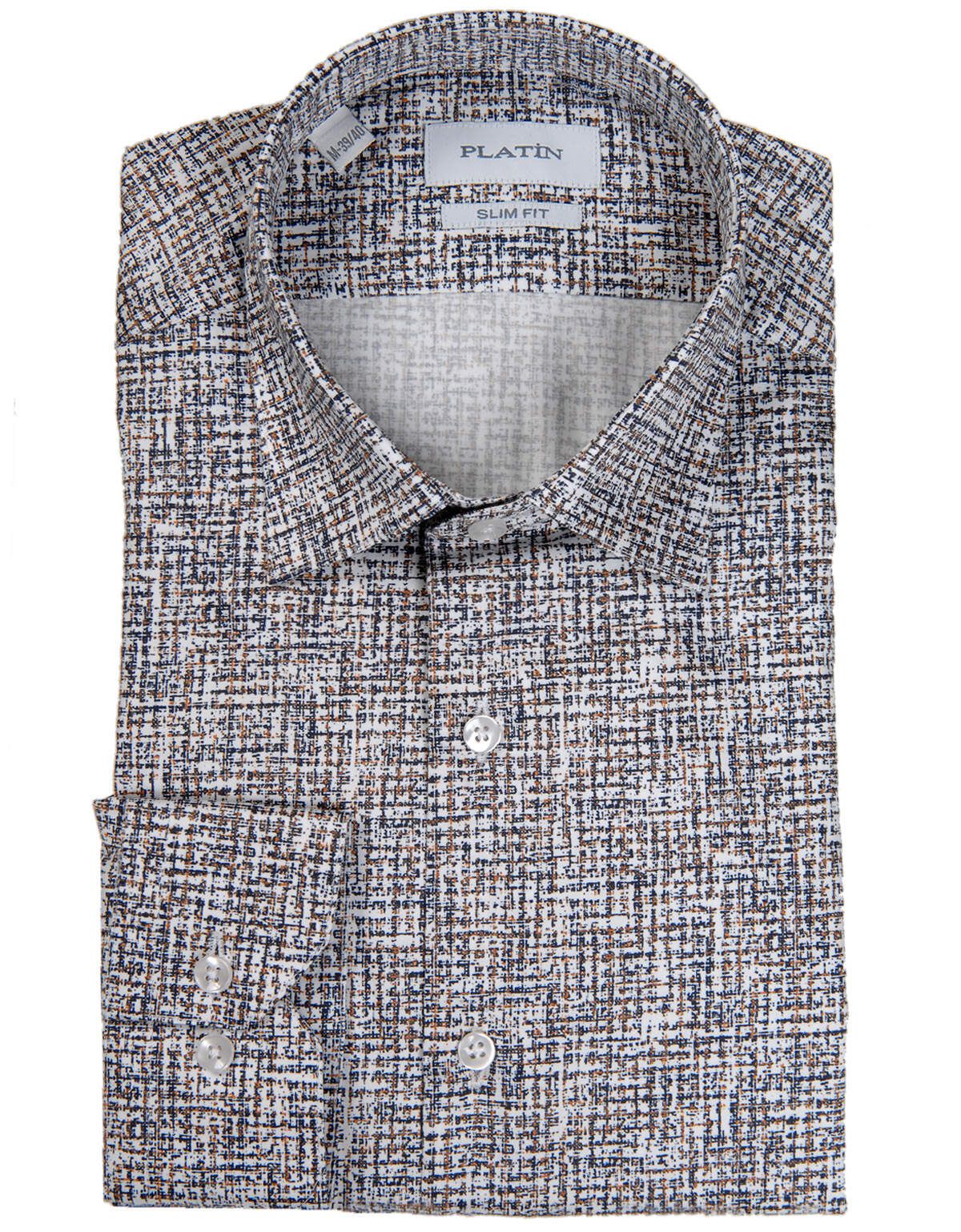 Сорочка мужская турецкого бренда PLATIN линии Slim Fit с абстрактым, дизайнерским рисунком в серо-коричневых тонах.