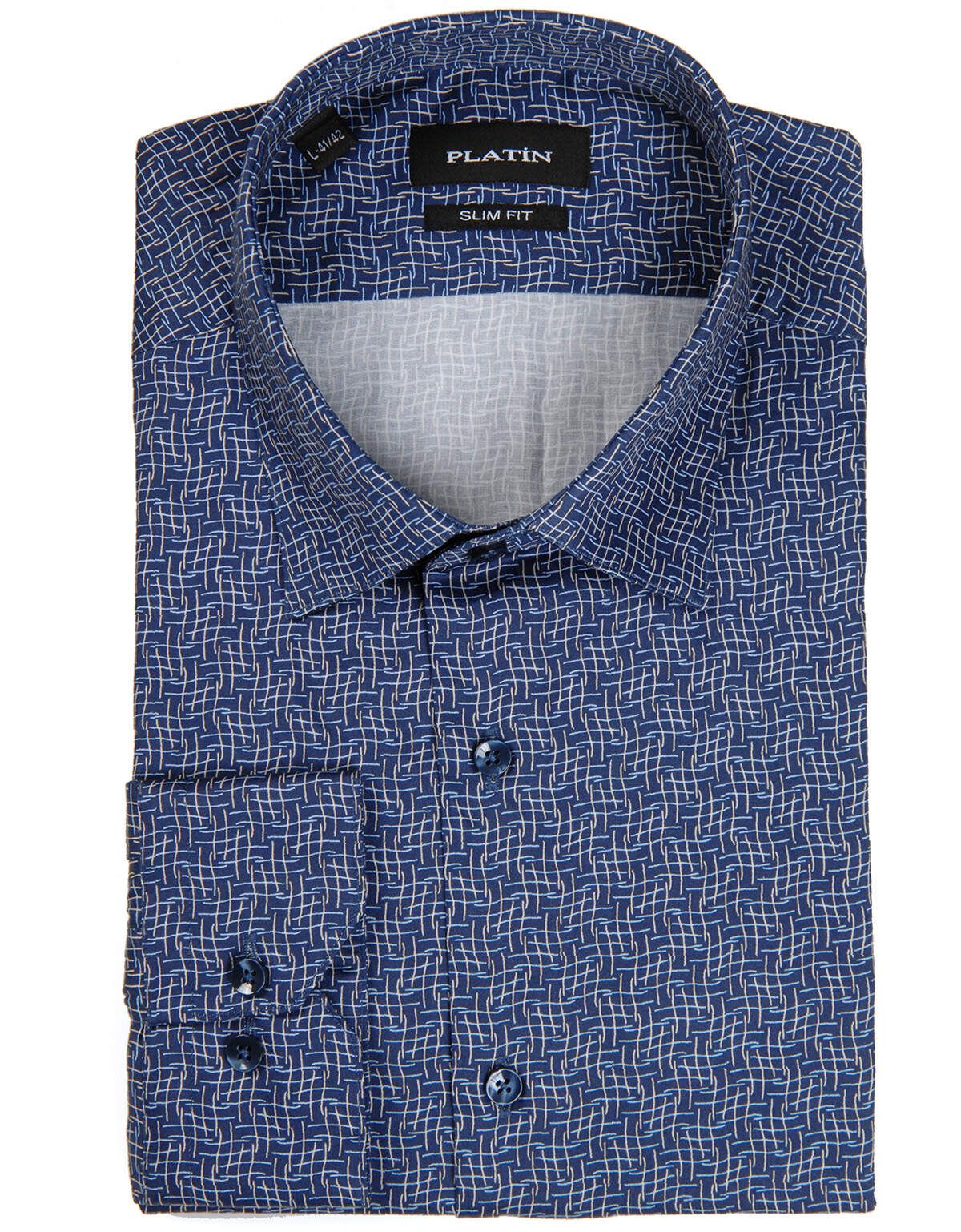 Сорочка мужская турецкого бренда PLATIN линии Slim Fit тёмно-синего цвета с дизайнерским, геометрическим рисунком в бежево-голубых тонах.