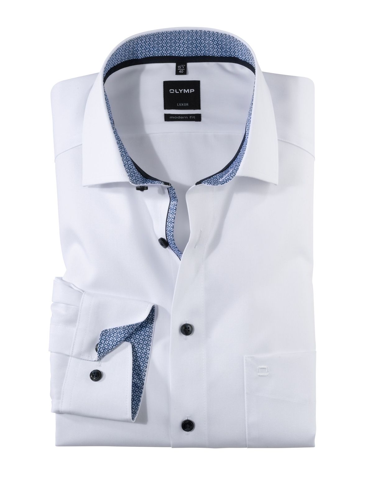 Хлопковая ткань белого цвета идеально сочетается со стильно подобранной контрастной синей тканью с рисунком на внутренней стороне воротника и манжетах.