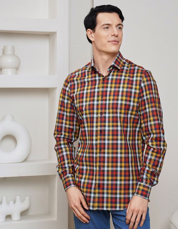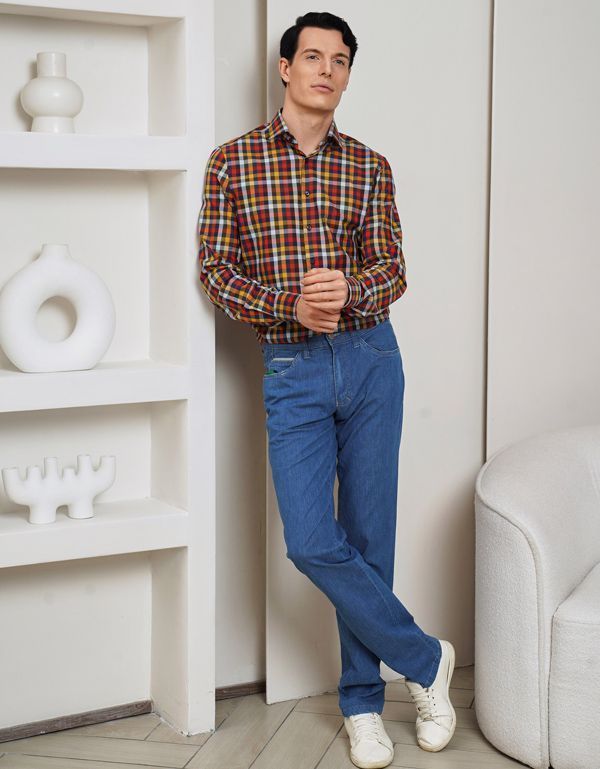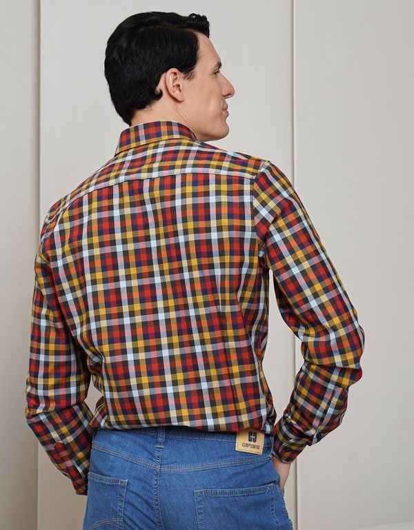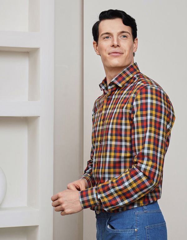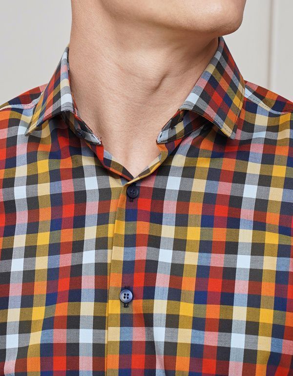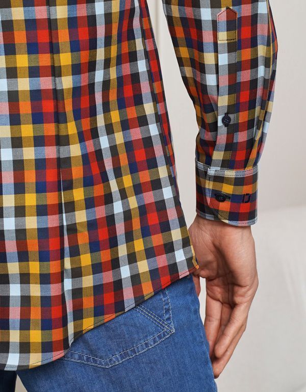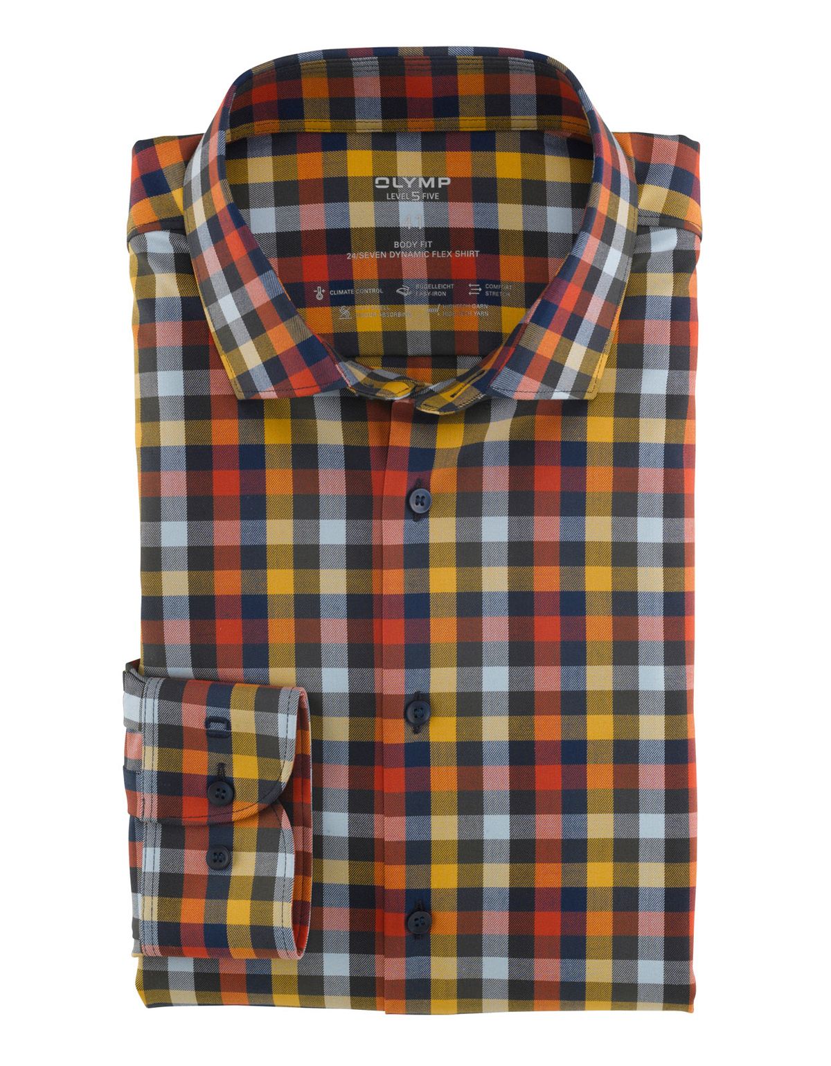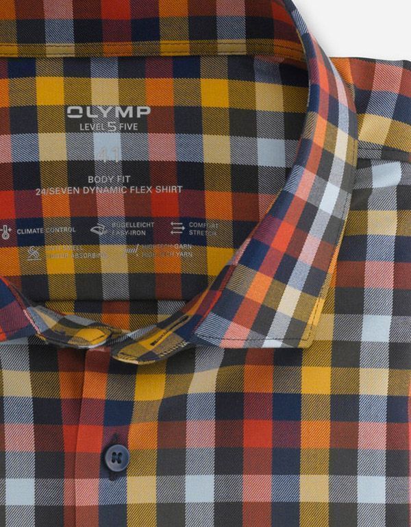 Мужская рубашка OLYMP новой линии Level five 24/7 с рисунком в многоцветную клетку, с тёмными пуговицами, классическим воротником.