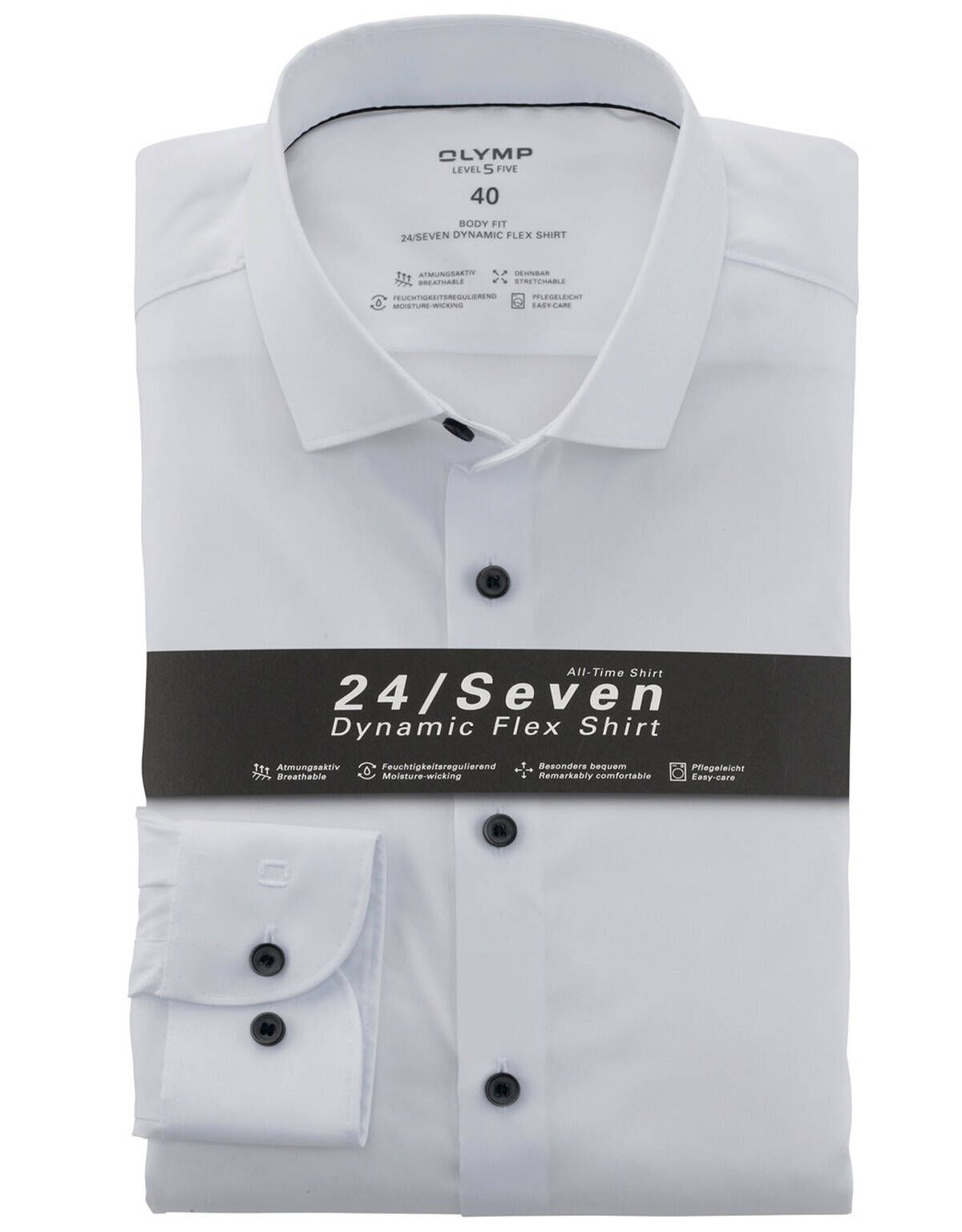 Мужская рубашка OLYMP новой линии Level five 24/7 однотонная, белого цвета с тёмными, контрастными пуговицами, классическим воротником.