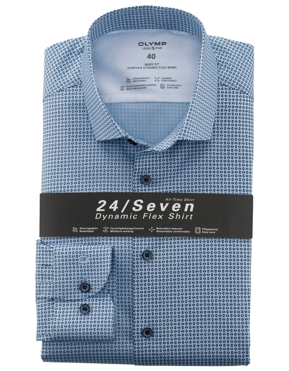 Мужская рубашка OLYMP новой линии Level five 24/7 голубого цвета с мелким, геометрическим рисунком в синих тонах и тёмными, контрастными пуговицами, классическим воротником.