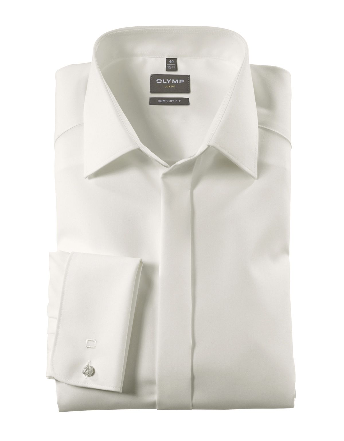 Эксклюзивная мужская сорочка OLYMP Luxor Soirée Comfort Fit цвета шампань с рукавом под запонку излучает особую элегантность.