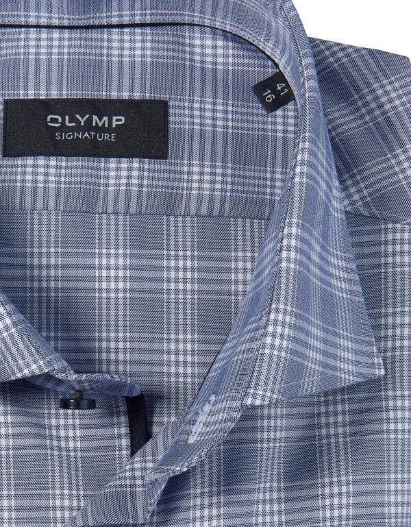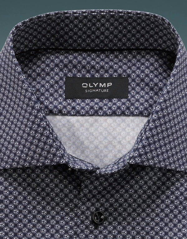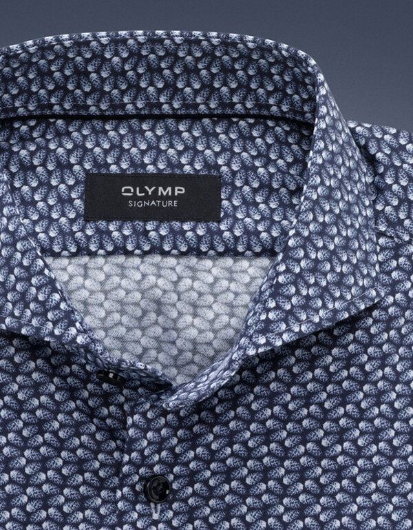 Мужская сорочка OLYMP премиум класса модели Signature с длинным рукавом, тёмно-синего цвета с белым, геометрическим рисунком.