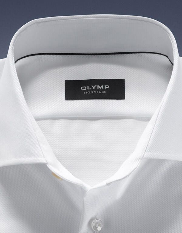Мужская сорочка OLYMP премиум класса модели Signature с длинным рукавом, белого цвета из структурной ткани с тонким, тёмным кантом в вороте.