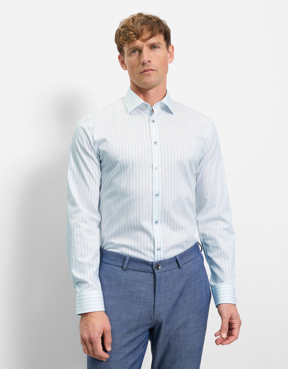 - Рубашки в полоску — это идеальный выбор для тех, кто не выбирает между классическим и повседневным стилем. За счёт тонких голубых полос на белом фоне , она подходит для делового стиля и полуофициального дресс кода.