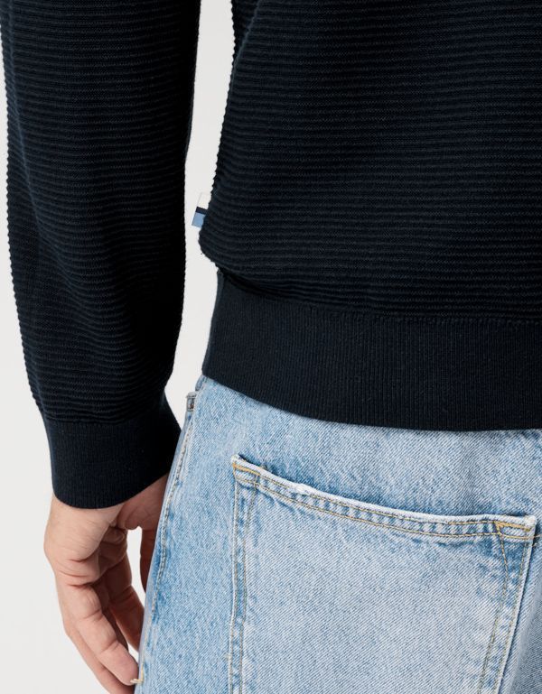 Модель тёмно-синего цвета, полуприталенного силуэта, с круглым вырезом горловины исполнена структурной вязкой.