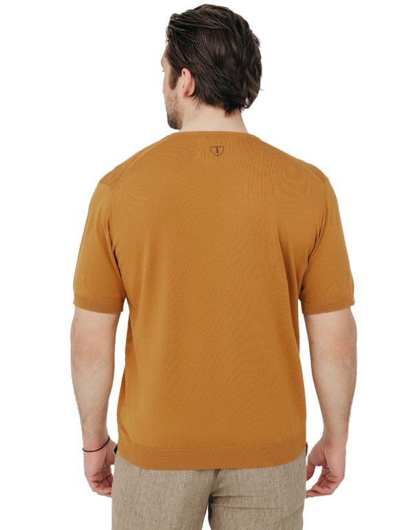 Джемпер мужской бренда Gratude горчичного цвета с коротким рукавом и круглым вырезом горловины.
