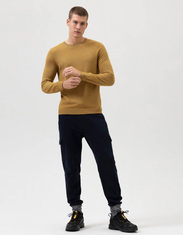 Джемпер мужской немецкого бренда OLYMP цвета охры с круглым вырезом горловины из 100% шерсти, приталенного силуэта.