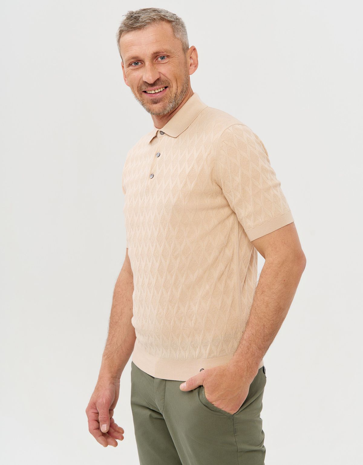 Обратите внимание на бежевое вязаное поло бренда GRATUDE.