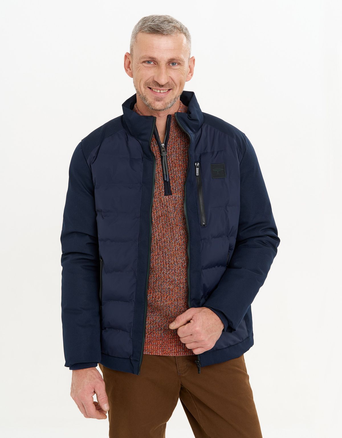 Куртка изготовлена из водоотталкивающей плащевки тёмно-синего цвета и комбинированной ткани с диагональным плетением на рукавах, воротнике и части спинки, которая надежно защищают от ветра и дождя, даря ощущение уюта даже в непогоду.