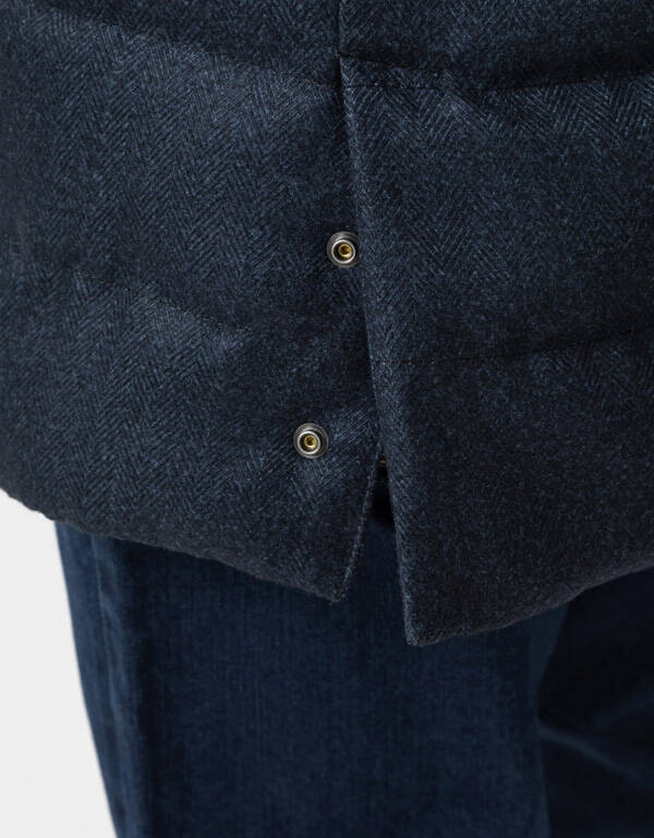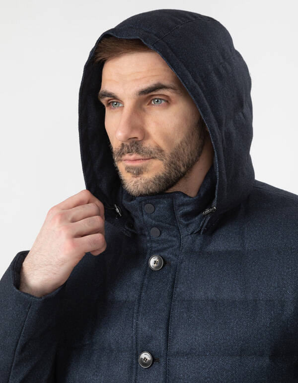 Воротник-стойка застёгивается на две кнопки. Модель пуховика с застежкой на молнию и пуговицы из натурального рога. По низу борта потайная кнопка. Съемный капюшон на кнопках, планка убирается в воротник, пата регулирует глубину капюшона, кулиска регулирует объем по краю.