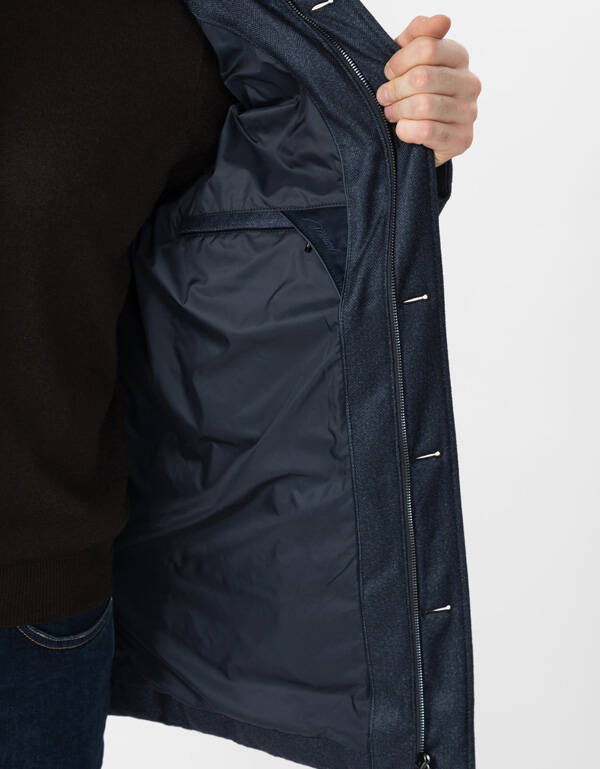Ткань верха защищает от ветра, влаги и холода. Благодаря особым свойствам структуры волокон, способным отводить влагу - между пуховиком и телом поддерживается сухой и теплый микроклимат. Подкладка из износостойкой ткани темно-синего цвета с рисунком " ёлочка ".