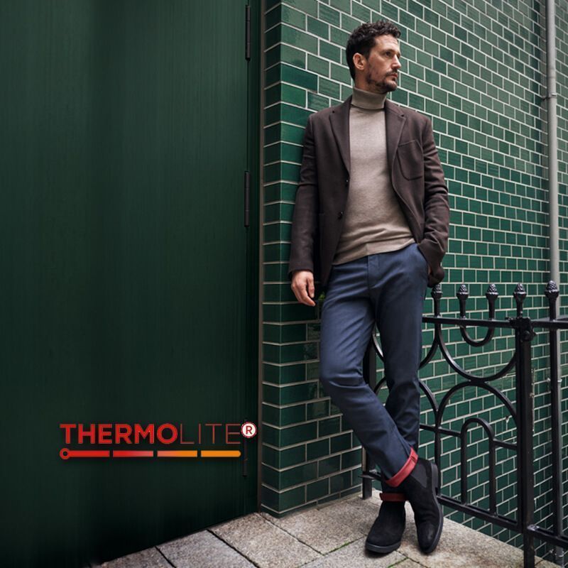 Важно понимать: в термобрюках Thermolite® не используется отдельная объёмная подкладка. Высокотехнологичная микроволоконная ткань крепится непосредственно к изнаночной стороне основного материала. Благодаря этому брюки выглядят как классические слаксы или чиносы, но при этом обладают выраженными теплосберегающими свойствами.