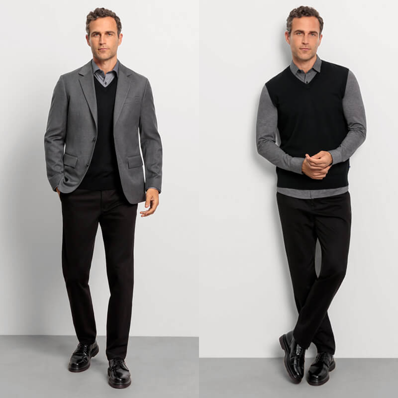 • Комбинация: Белая рубашка + темно-серый жилет + темные брюки + черные туфли.